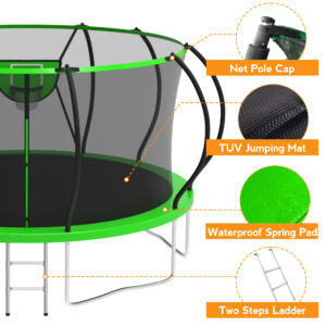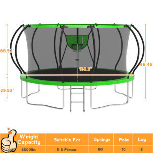 The 14 ft trampoline is equipped with wear-resistant and high-density, anti-UV jumping mat that stands up to high pressure. 80 oversized 7″ galvanized springs with strong stretch and rebound, providing a very strong elasticity and holding up to 1400 lbs. When your families play on our kid trampoline, they can jump higher. And the ladder ensures absolute safety for your children to climb in and out.