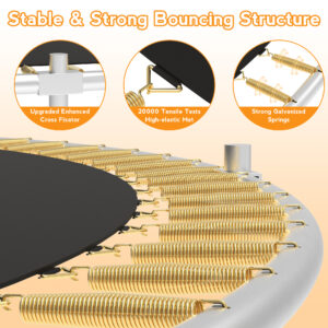 ① We have upgraded the product so that the trampoline has a longer product life. The frame is made of galvanized steel pipe. 3pcs legs with 6pcs balanced contact points for better stability and safety. PVC Spring Cover Padding is waterproof. And added a stainless steel ladder for kids to up and down stairs.