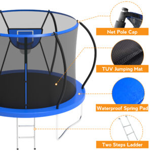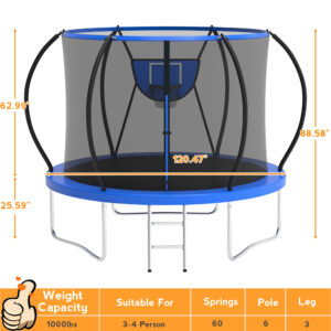 The 10 ft trampoline is equipped with wear-resistant and high-density, anti-UV jumping mat that stands up to high pressure. 60 oversized 7″ galvanized springs with strong stretch and rebound, providing a very strong elasticity and holding up to 1000 lbs. When your families play on our kid trampoline, they can jump higher. And the ladder ensures absolute safety for your children to climb in and out.